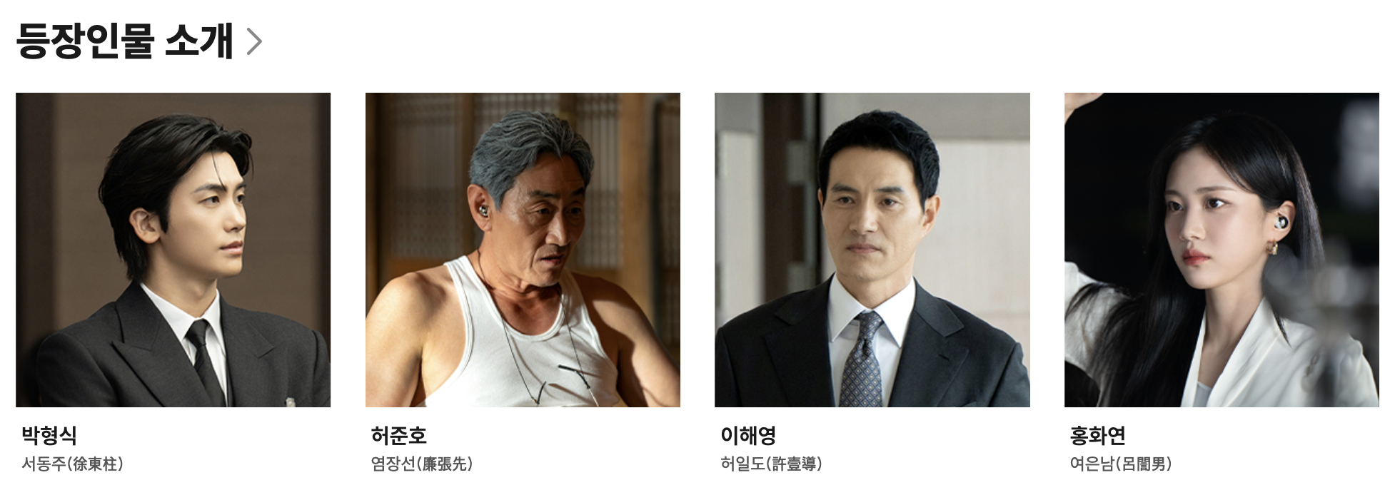 절대 악의 상징이자 권력의 정점에 선 인물이에요. 단순한 악역이 아니라, 목적을 위해서라면 수단과 방법을 가리지 않는 냉혹함이 소름 끼칠 정도예요. 허준호 배우의 중후한 카리스마 덕분에 이 캐릭터의 무게감이 더 살아났어요. 화면에 등장할 때마다 긴장감이 팽팽하게 흐르죠😨