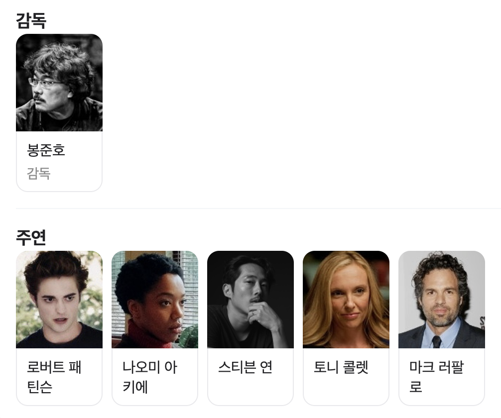 - 주연 배우: 로버트 패틴슨, 나오미 애키, 스티븐 연, 토니 콜레트, 마크 러팔로