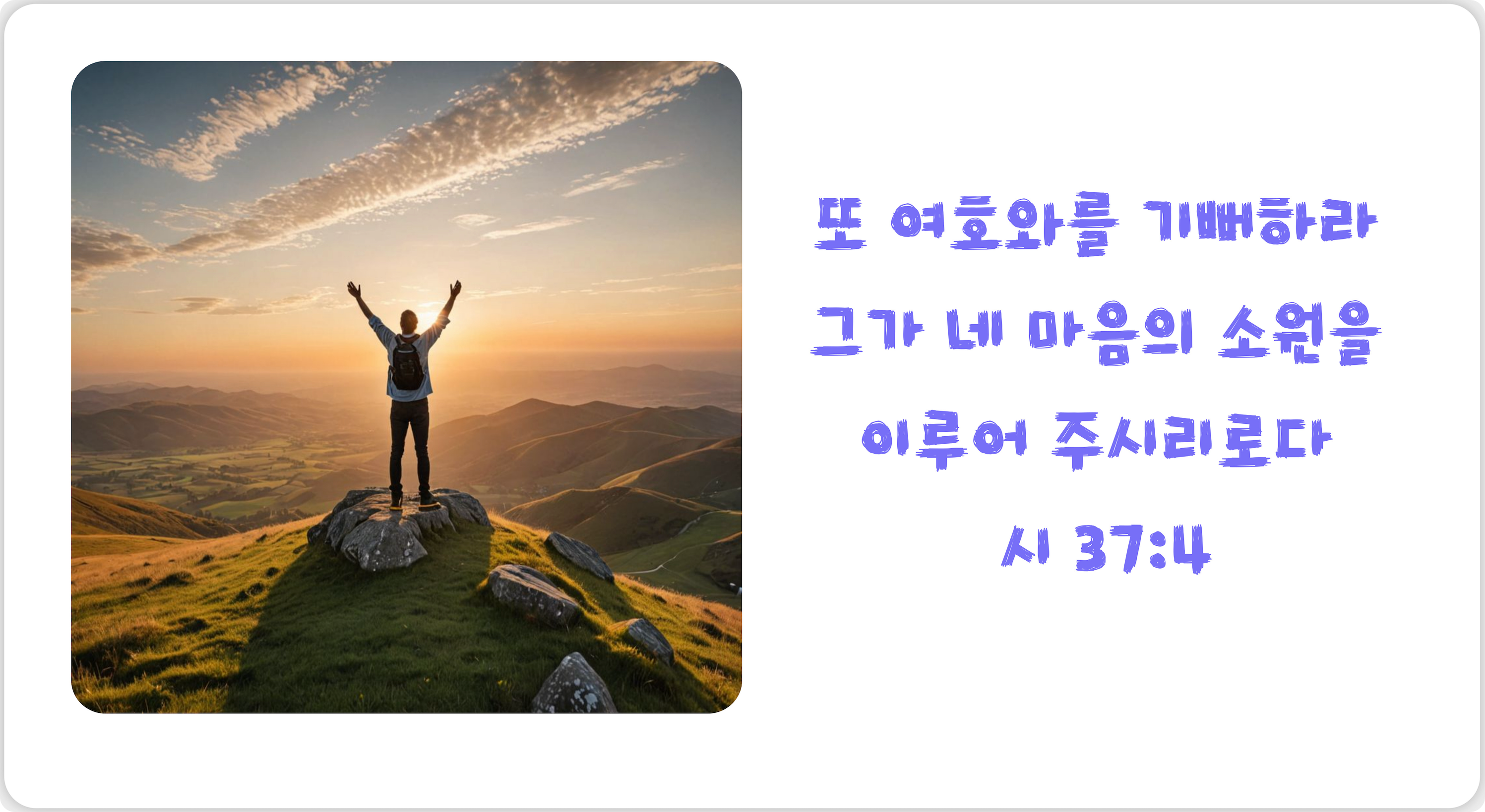 "또 여호와를 기뻐하라 그가 네 마음의 소원을 네게 이루어 주시리로다" – 시편 37:4 (개역개정)