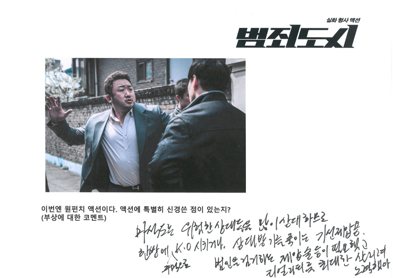 - "마동석의 압도적인 존재감과 강렬한 액션 장면들이 인상적이었어요. 범죄 스릴러 팬이라면 꼭 봐야 할 영화입니다."