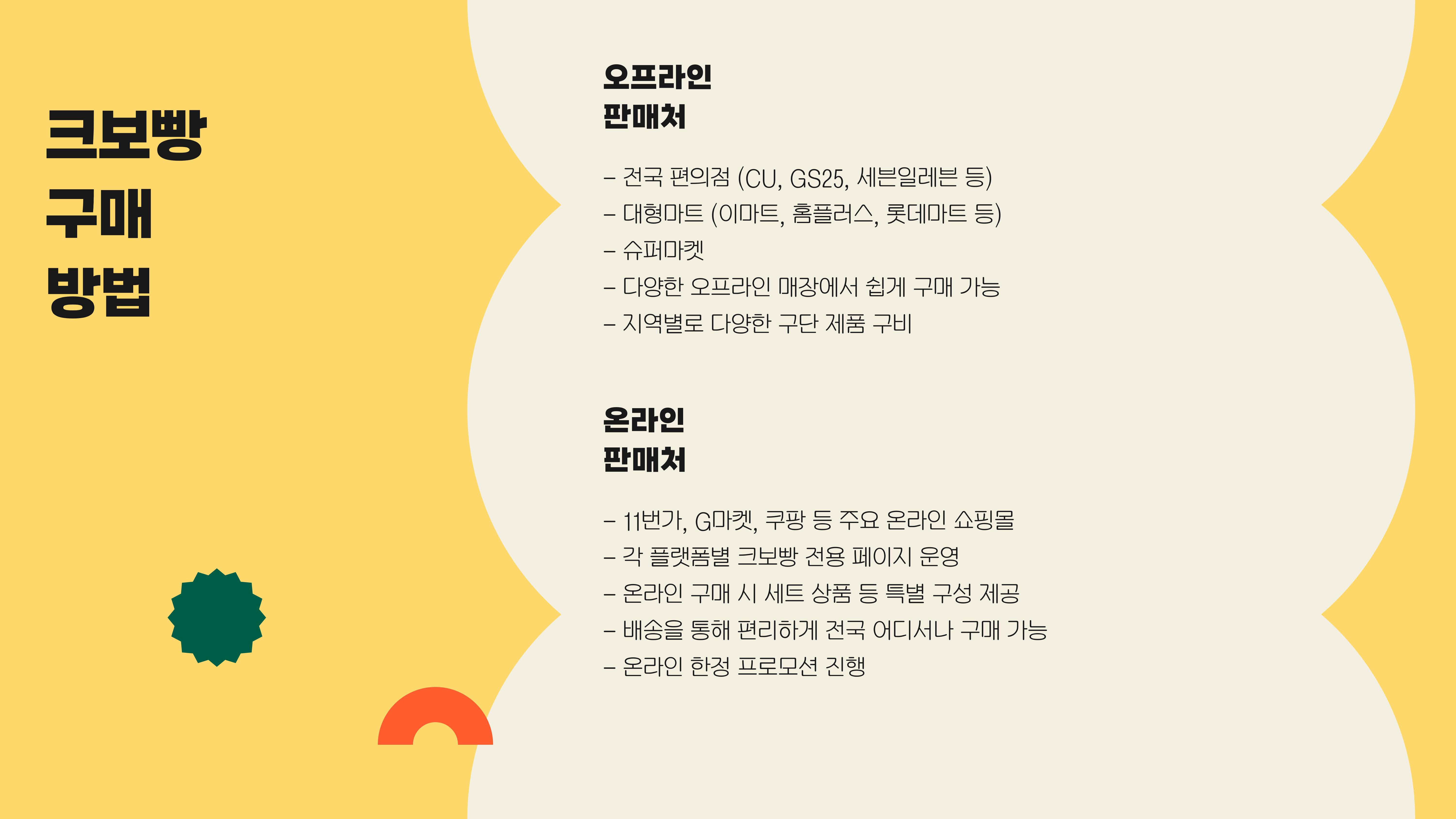 크보빵은 전국의 편의점, 슈퍼마켓, 온라인 쇼핑몰에서 구매 가능합니다.