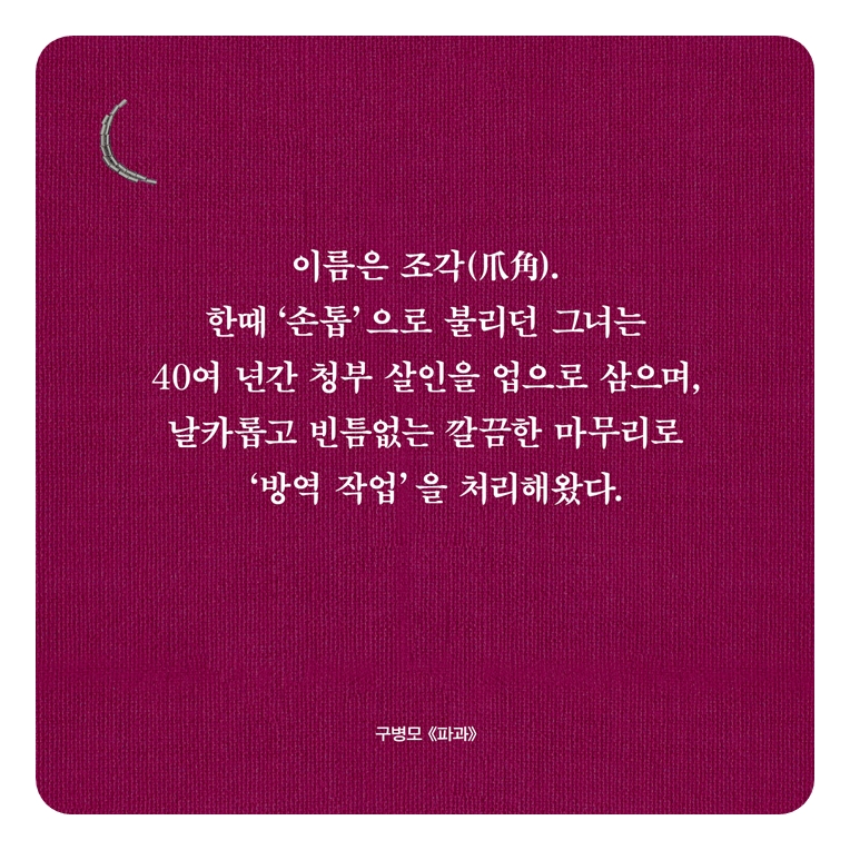『파과』는 구병모 작가가 2013년에 출간한 장편소설로, 최근 화제의 뮤지컬 원작으로도 재조명되며 다시금 뜨거운 관심을 받고 있다. 주인공은 다름 아닌 60대의 여성 킬러, 이름은 '조각(爪角)'. 과거엔 "손톱"이라 불리며 냉철한 청부살인의 전문가였고, 그 어떤 망설임도 없이 깔끔하게 임무를 처리해왔다.