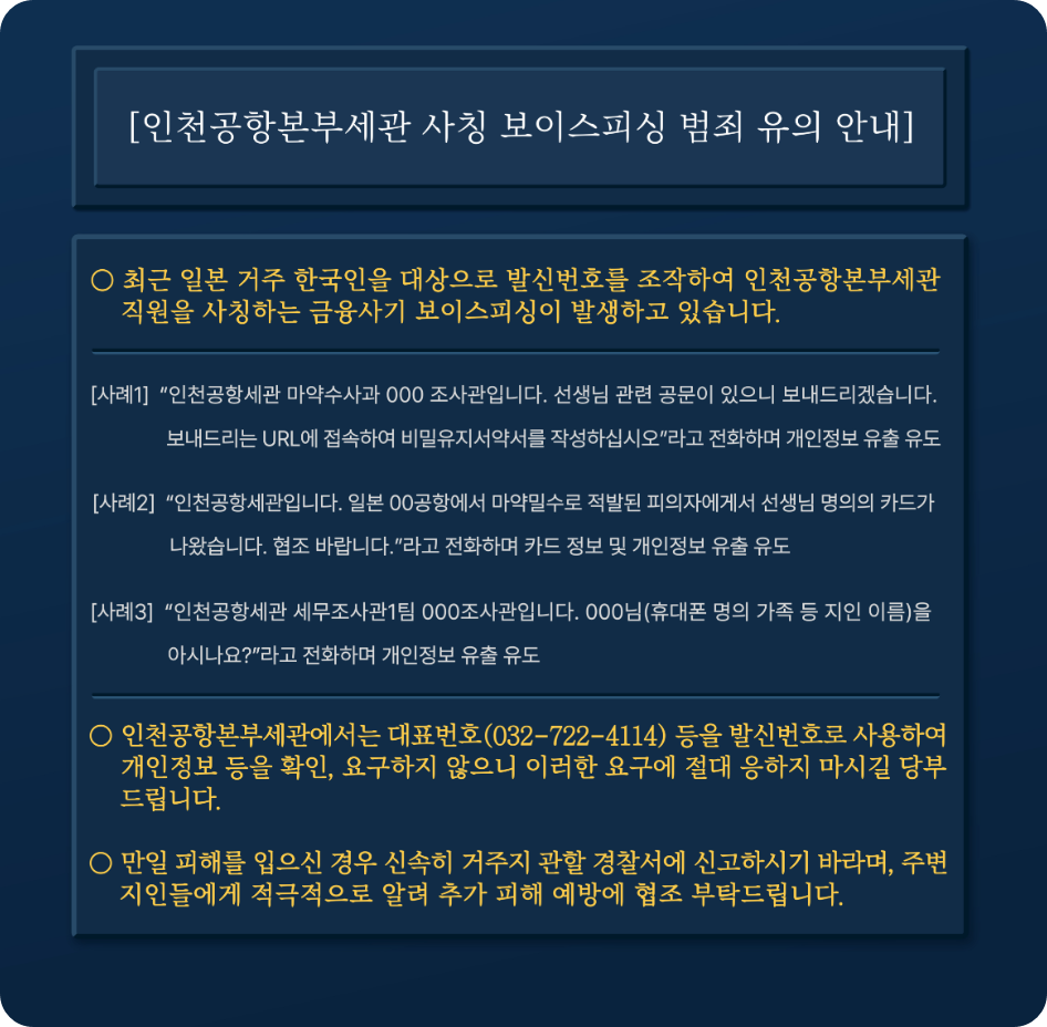 최근 인천공항본부세관 사칭 보이스피싱이 해외 교민까지 노리고 있다는 관세청 공지가 올라왔습니다.
